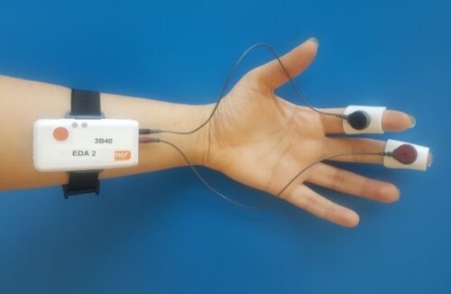 - Sensor in a wristband that detects skin conductivity (EDA), heartrate variability (HRV) and movements
